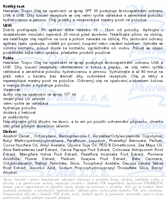 Hawaiian Tropic Olej na opalování ve spreji SPF 30 poskytuje širokospektrální ochranu UVA a UVB. Díky luxusní receptuře se olej velmi rychle vstřebává a zanechává pokožku hydratovanou a jemnou. Olej je lehký a nezanechává mastný pocit na pokožce.