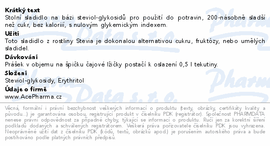 Stolní sladidlo na bázi steviol-glykosidů pro použití do potravin, 200-násobně sladší než cukr, bez kaloriií, s nulovým glykemickým indexem.