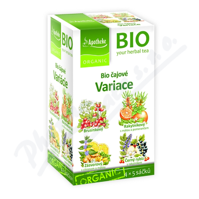BIO Čajové variace zahrnují 4 druhy ovocných čajů. (Zázvorový čaj s citronem a mátou; Rakytníkový čaj s mátou a pomerančem; Brusinkový ovocný čaj; Černý rybíz s rakytníkem).