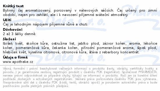 Bylinný čaj aromatizovaný, porcovaný v nálevových sáčcích. Čaj určený pro zimní období, nejen pro zahřátí, ale i k navození příjemné sváteční atmosféry.