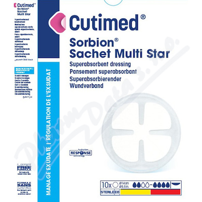 Cutimed Sorbion Sachet Multistar je sterilní, hydroaktivní krytí na rány, které tvoří gel a silně absorbuje exsudáty. Krytí do svého superabsorpčního jádra absorbuje exsudát z rány a spolehlivě jej zadržuje i při kompresi.