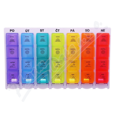 Týdenní dávkovač léků je rozdělen na 7 dní v týdnu pomocí zkratek názvů dnů v týdnu a každý den má 4 části - ráno, odpoledne, večer, noc. Každá část se otevírá samostatně pomocí víčka, zatímco ostatní zůstávají pečlivě uzavřeny.