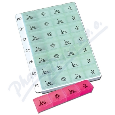 Sada obsahuje týdenní dávkovač na léky (typ 04) a denní dávkovač typ 04 v různých barevných provedeních. Dávkovače mají 4 přihrádky a slouží k přehlednému a spolehlivému dávkování a uložení léků doma i na cestách.