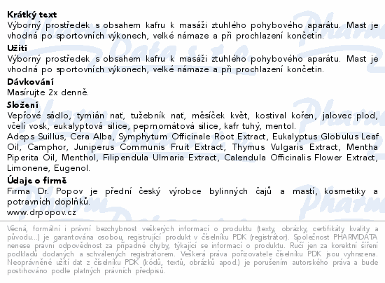 Výborný prostředek s obsahem kafru k masáži ztuhlého pohybového aparátu. Mast je vhodná po sportovních výkonech, velké námaze a při prochlazení končetin.