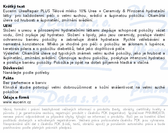Eucerin UreaRepair PLUS Tělové mléko 10% Urea + Ceramidy & Přirozené hydratační látky: pro každodenní péči o velmi suchou, svědící a šupinatou pokožku. Okamžitá úleva od hrubosti a šupinatění, zmírnění svědění.