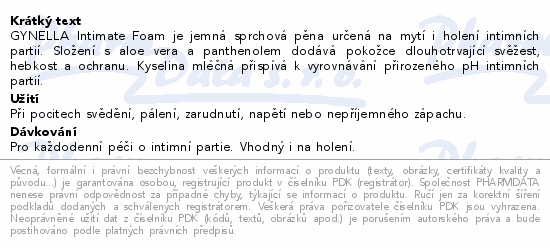 GYNELLA Intimate Foam je jemná sprchová pěna určená na mytí i holení intimních partií. Složení s aloe vera a panthenolem dodává pokožce dlouhotrvající svěžest, hebkost a ochranu. Kyselina mléčná přispívá k vyrovnávání přirozeného pH intimních partií.