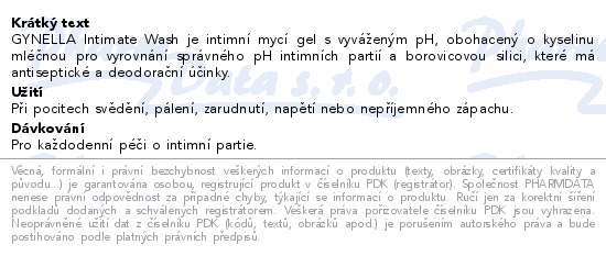 GYNELLA Intimate Wash je intimní mycí gel s vyváženým pH, obohacený o kyselinu mléčnou pro vyrovnání správného pH intimních partií a borovicovou silici, které má antiseptické a deodorační účinky.