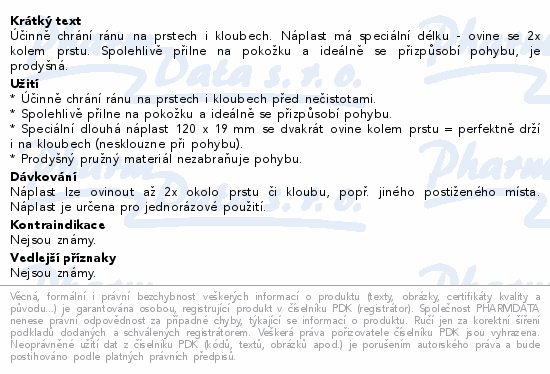 Účinně chrání ránu na prstech i kloubech. Náplast má speciální délku - ovine se 2x kolem prstu. Spolehlivě přilne na pokožku a ideálně se přizpůsobí pohybu, je prodyšná.