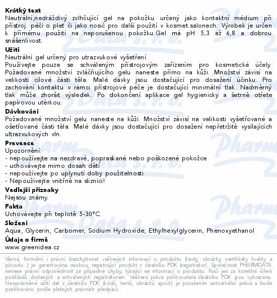 Neutrální,nedráždivý zvlhčující gel na pokožku určený jako kontaktní médium při přístroj. péči o pleť či jako nosič pro další použití v kosmet.salonech. Výrobek je určen k přímému použití na neporušenou pokožku.Gel má pH 5,3 až 6,8 a dobrou snášenlivost.