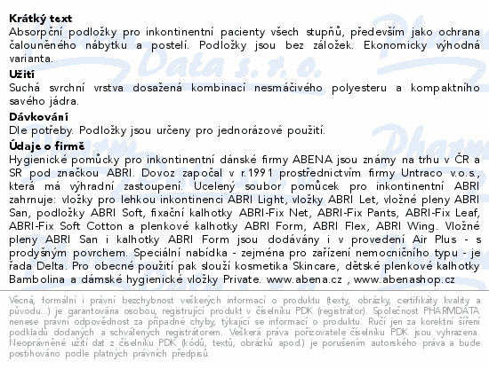 Absorpční podložky pro inkontinentní pacienty všech stupňů, především jako ochrana čalouněného nábytku a postelí. Podložky jsou bez záložek. Ekonomicky výhodná varianta.