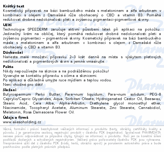 Kosmetický přípravek na bázi bambuckého másla s melatoninem a alfa arbutinem v kombinaci s olejem z Damašské růže obohacený o CBD a vitamin B3. Pomáhá redukovat drobné nedokonalosti pleti a zvýšenou pigmentaci-pigmentové skvrny.