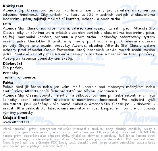 Attends Slip Classic pro těžkou inkontinenci jsou určeny pro uživatele s nadměrnou tělesnou hmotností. Díky unikátnímu tvaru zvláště v zadních partiích a elastickému bedernímu pásu, zajišťují maximální komfort, ochranu a pocit sucha.