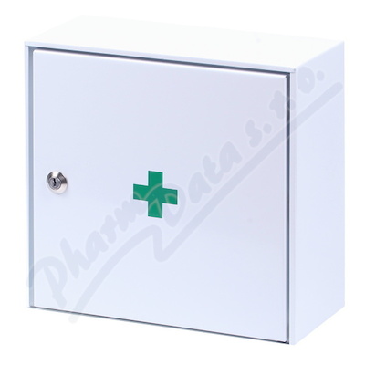 Nástěnná lékárna se zdravotnickými prostředky v kovové, uzamykatelné skříňce pro domácnosti a firmy do 10-ti osob. Obsahuje větší množství obvazového materiálu, základní vybavení pro poskytnutí první pomoci do příjezdu lékaře.