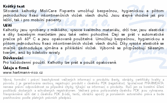 Síťované kalhotky MoliCare Fixpants umožňují bezpečnou, hygienickou a přitom jednoduchou fixaci inkontinenčních vložek všech druhů. Jsou stejně vhodné jak pro ležící, tak i pro mobilní pacienty.