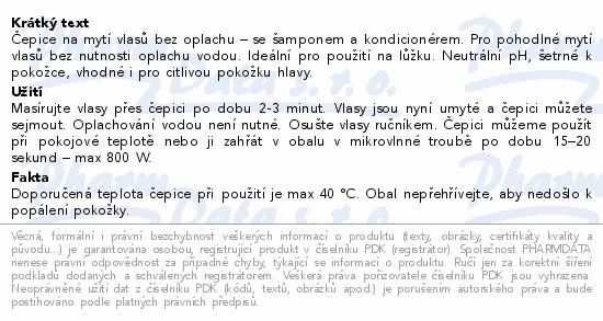 Čepice na mytí vlasů bez oplachu – se šamponem a kondicionérem. Pro pohodlné mytí vlasů bez nutnosti oplachu vodou. Ideální pro použití na lůžku. Neutrální pH, šetrné k pokožce, vhodné i pro citlivou pokožku hlavy.
