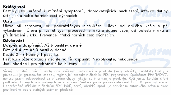 Pastilky jsou určené k mírnění symptomů, doprovázejících nachlazení, infekce dutiny ústní, krku nebo horních cest dýchacích.