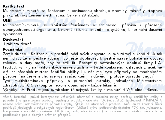 Multivitamín-minerál se ženšenem a echinaceou obsahuje vitamíny, minerály, stopové prvky, sibiřský ženšen a echinaceu. Celkem 28 složek.
