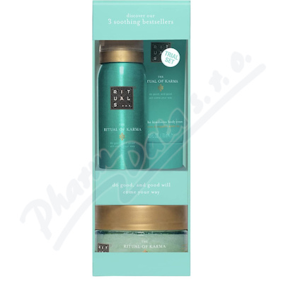 Dárkové balení The Ritual of Karma sprchovým gelem 50 ml, tělovým krémem 70 ml a tělovým peelingem 125 g pro ženy. Tato řada je inspirovaná hinduistickou filozofií, pozitivní energií a letními vibracemi.