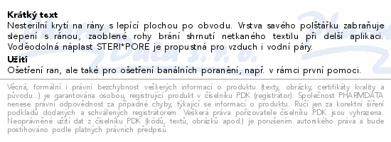 Nesterilní krytí na rány s lepící plochou po obvodu. Vrstva savého polštářku zabraňuje slepení s ránou, zaoblené rohy brání shrnutí netkaného textilu při delší aplikaci. Voděodolná náplast STERI*PORE je propustná pro vzduch i vodní páry.