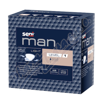Anatomicky tvarované, trojúhelníkové inkontinenční vložky Seni Man Light Level 1 pro kapénkovou inkontinenci. Upevnění ke spodnímu prádlu pomocí lepicích proužků - jeden podél vložky a dva u horního okraje. Rozměr 18 x 14 cm. Savost 150 g. Bez latexu.