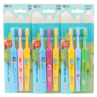 Sada dětských zubních kartáčků pro děti od 0 do 3 let. Malá trojúhelníková hlavice, x-soft vlákna s doporučovaným rovným zástřihem. Ploché držátko je ideální pro malou ruku i pro společné čištění s asistencí rodičů. 3 ks v balení, blistr.