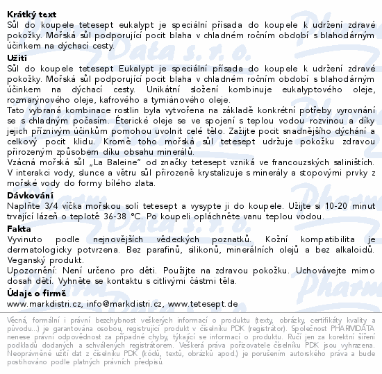 Sůl do koupele tetesept eukalypt je speciální přísada do koupele k udržení zdravé pokožky. Mořská sůl podporující pocit blaha v chladném ročním období s blahodárným účinkem na dýchací cesty.