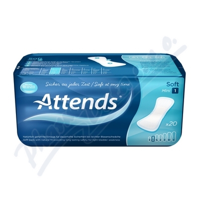 Ochranná pomůcka pro lehký stupeň úniku moči z měkké netkané textílie. Vložky Attends Soft mají bezpečné, velmi účinné savé jádro, díky kterému se vlhkost rychle vstřebává a je odvedena z povrchu dovnitř savého jádra, kde se uzamkne.